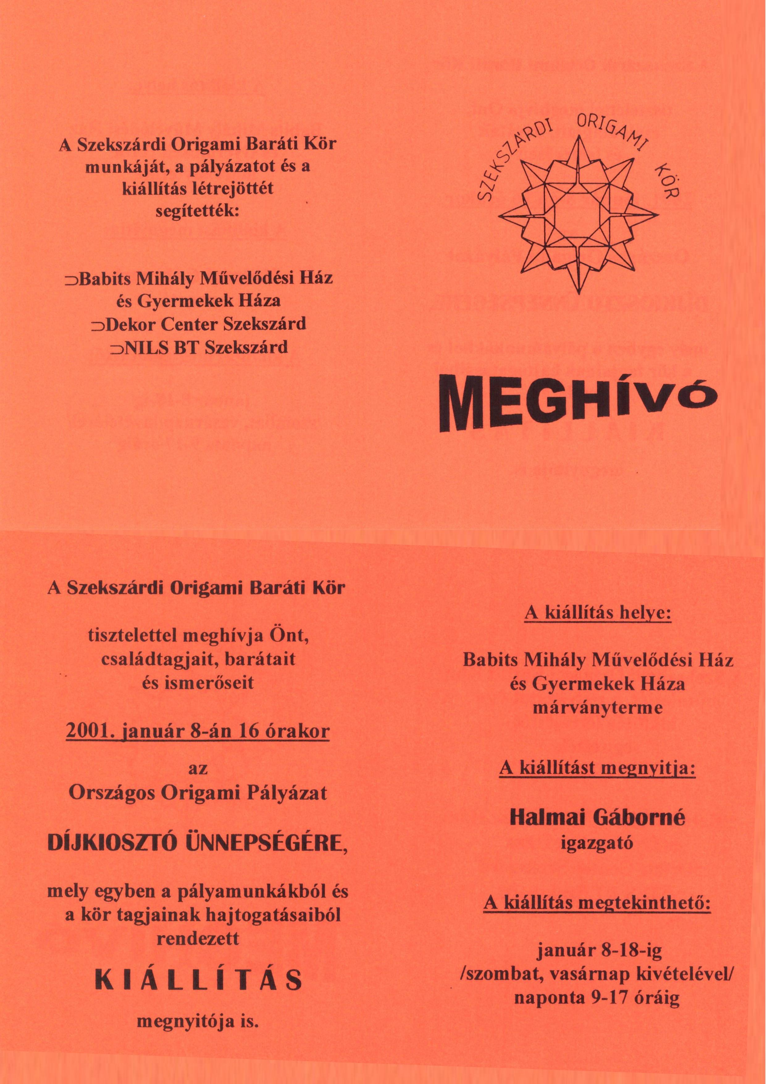 Országos origami pályázat és kiállítás - Szekszárd 2000-2001 | 2001. 01. 18. 18.30 |
